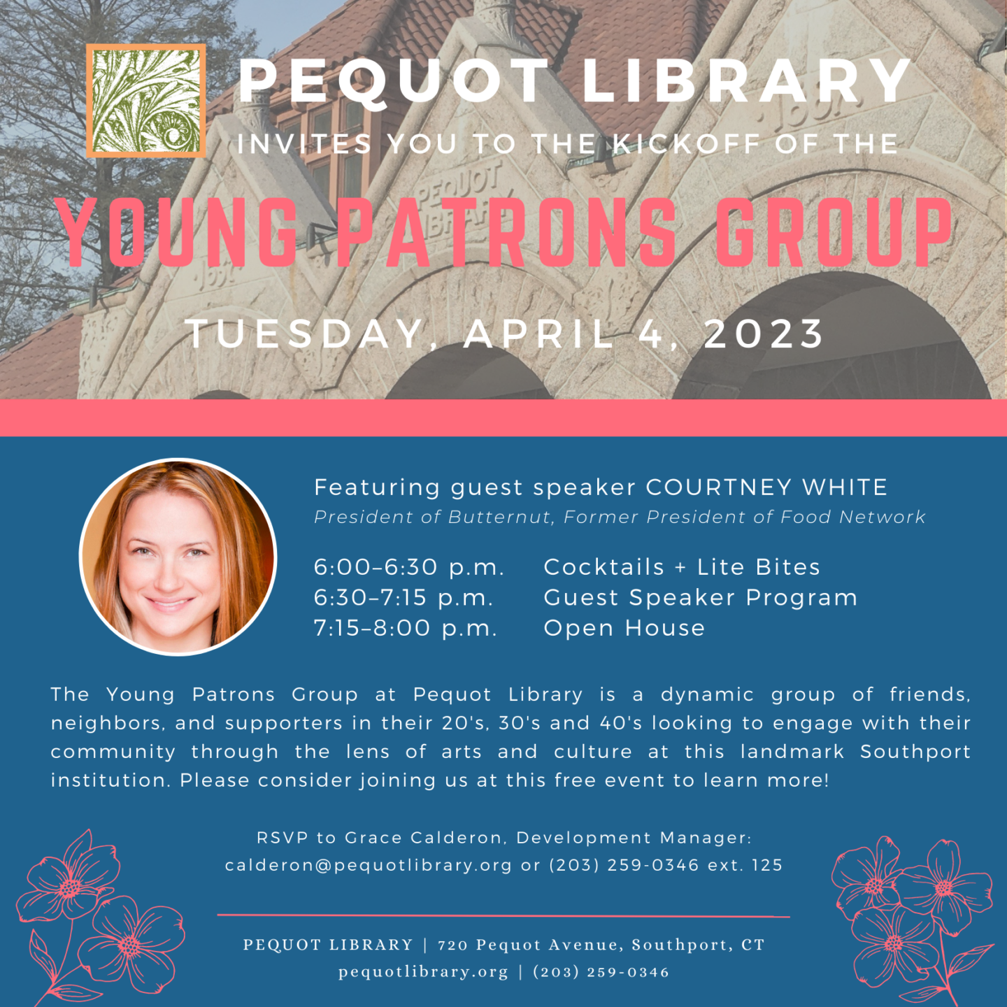 Celebrate the launch of our Young Patrons Group with an event on Tuesday, April 4, which is also Library Giving Day. This program is free and open to the public as an opportunity to showcase Pequot Library and educate our young (or young at heart) friends and neighbors about all we have to offer to the community. Courtney White will return as our speaker to talk about her time as the president of the Food Network with Ina Garten, Bobby Flay, and Guy Fieri! White is the President of Butternut, a lifestyle and entertainment media company.