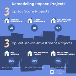 Certain home remodeling projects are making homeowners happier and proving to be well worth the cost and time when they sell their properties, according to a new survey from the National Association of REALTORS. “REALTORS® and homeowners alike recognize the value of taking on a major home remodeling project,” says NAR President John Smaby. “While these tasks can be time-consuming and costly, the projects are well worth the temporary inconveniences, as this report shows, and the final products ultimately reward us with feelings of accomplishment, satisfaction, and higher home values.” NAR calculated a “joy score” for each home remodeling project studied. The score, a scale from one to 10, is based on homeowners’ overall perceived happiness with their renovations. The higher the joy score for the project, the more homeowners felt satisfaction from it. Some of the highest joy scores for interior projects centered on complete kitchen renovations, closet renovations, full interior and interior room paint jobs, kitchen upgrades, and basement conversions to living areas.