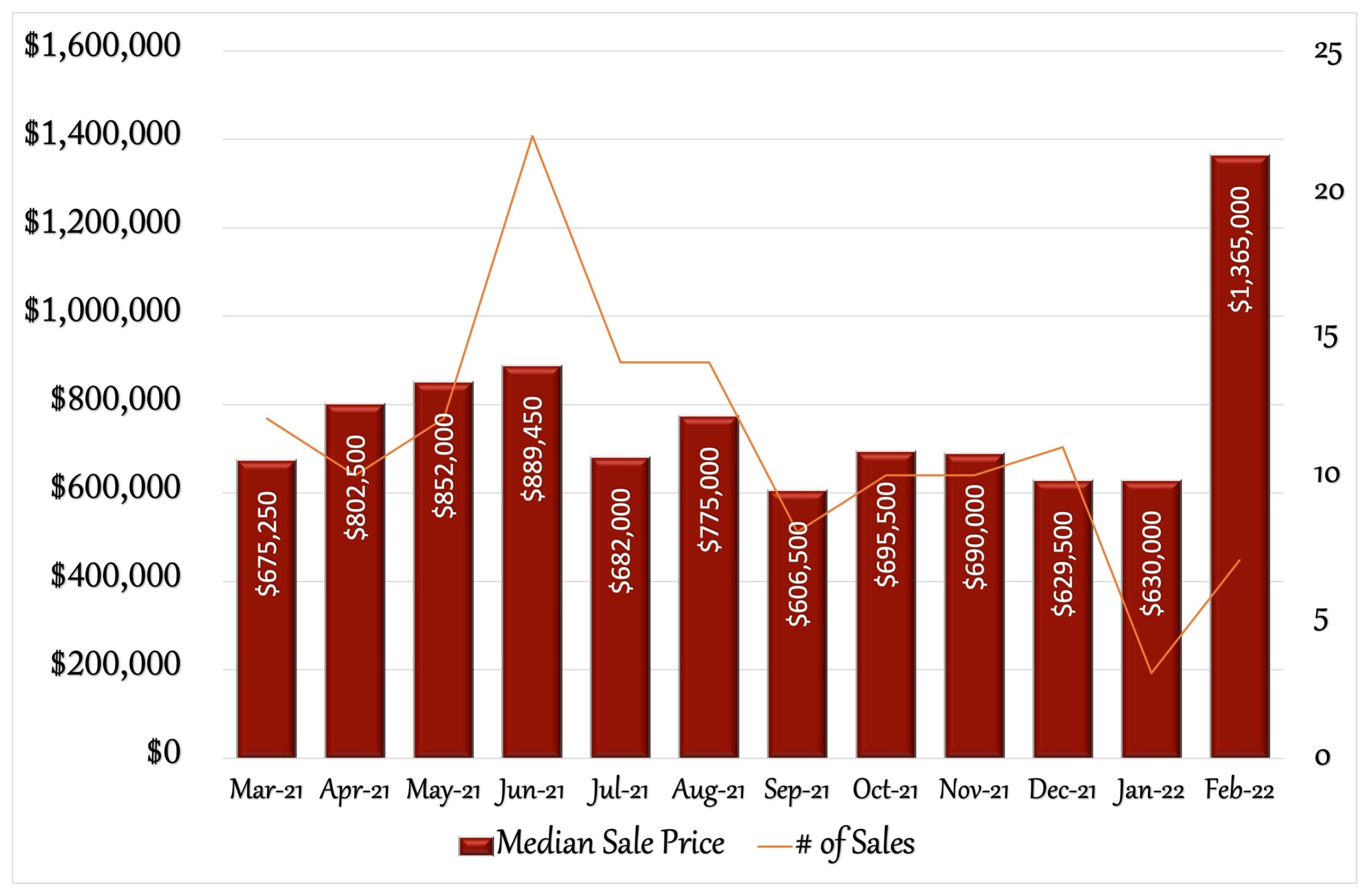 The Easton real estate market experienced an unusual monthly jump to the median sales price: a 116% increase over January, from $630,000 to $1,365,000 in February. In the past year, the monthly median sales price had been more steady, bouncing between a low of $606,500 in September to a high of $889,450 in June. The cause for February’s large shift was 4 larger homes that sold for well over $1,000,000. With just 7 homes that sold, the median or average sales price can easily be skewed. The average price of the 4 larger homes that sold was $1,732,500, while the average price of the 3 smaller homes was $475,833. In the past year, there were 135 homes sold with a median sales price of $730,000. Of those 135 homes, 103 sold for under $1,000,000 and 32 sold for over $1,000,000. If in a rare month, 4 homes sell for an average price of $1.7 million, that will be an unusual month indeed. Other than that, February was not too different from January. The number of home sold did nearly double from 3 to 7, but the time it took for those homes to sell jumped from 46 days to 56 days. New listings were about the same; 9 in January and 10 in February. The percentage of list price to sales price dropped from 100% for each of the past 6 months to 95.3% in February, not unexpected when considering the number of higher priced homes. Easton is still in a solid seller’s market, with just 2.2 months of supply. Pending sales increased slightly from 6 to 8 homes which is still low compared to previous months. Given the recent challenging political and economic climate, it is difficult to predict what the next few months will bring. Interest rates, after a brief decrease in late February, continued their rise in early March, back up to 3.85%. Still historically low, but potentially putting pressure on buyers budgets when factoring in increased property values and the recent rise in inflation. Many buyers still want to lock in these historically low rates before rates and home prices increase further. With such low inventory, buyers are eager for more home choices. For anyone considering a move, this is still a great time to sell a house in Easton. Do you know anyone looking for more information about their real estate market? I’d be happy to help.