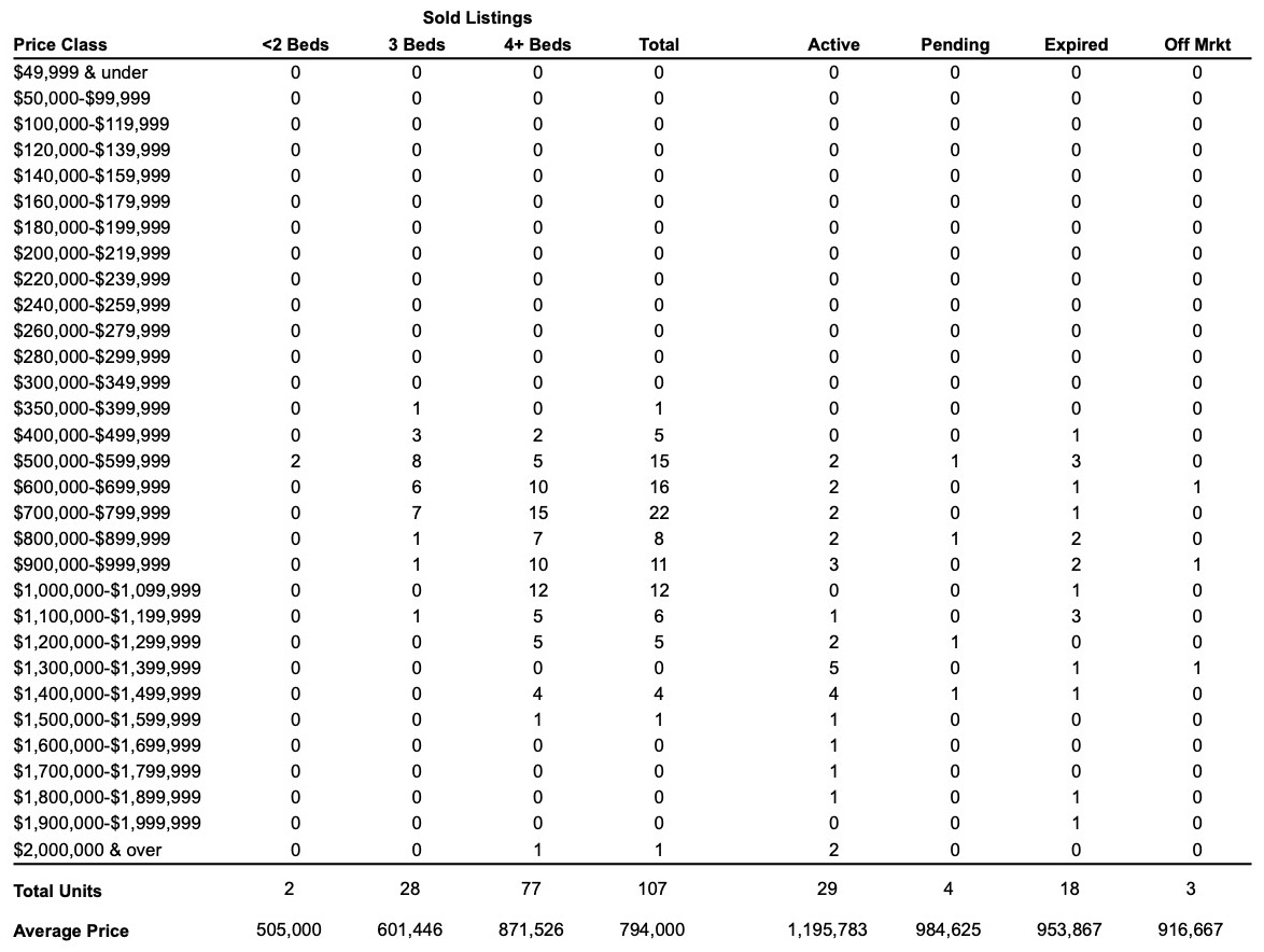 | 9 Elm Dr | Ranch | 3,788 | 3 | 2/1 | $899,000 | $899,000 | $857,500 | 95% | 41 |