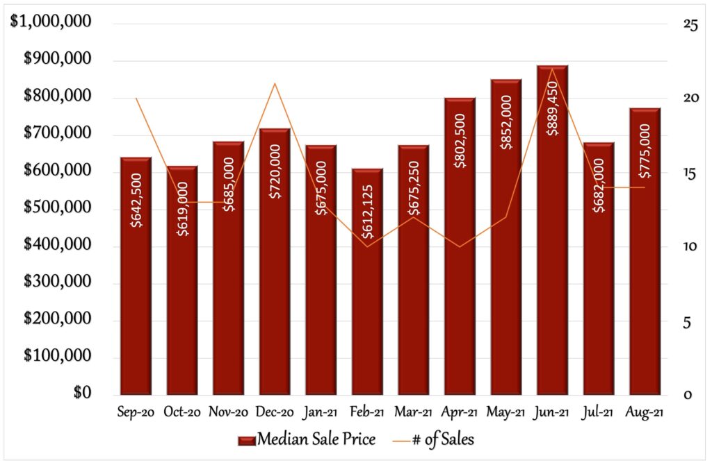 Easton’s real estate market experienced some gains in August over July’s slowdown. Although the number of home sold was the same (14), the median sales price was 13% higher; $682,000 in July to $775,000 in August. Although still below June’s peak of $889,400, July’s gains continue the month over month increases experienced from February through June, and put the median sales price up 14.81% since January. Perhaps contributing to the impressive monthly price increase was the decrease in inventory as the number of active listings was down by over 14% and the number of new listings was down by over 18% since July. The limited supply of house sold more quickly, just 27 days on market, as buyers faced more competition and continue to be advantaged by long standing low interest rates. The 30 year fixed rate continued its sub 3% trend. By months end, the rate was 2.87%. A decrease in the months of supply from 3.1 to 2.8 months, keeps Easton in a solid sellers’ market, a trend that has continued since December of 2020. Sellers also sold their homes very close to asking price as the % of list price to sales price was 99.7%. August was a solid month for sellers, and pending sales point to another good month for September. For anyone considering a move, this is still a great time to sell a house in Easton. Do you know anyone looking for more information about their real estate market? I’d be happy to help.